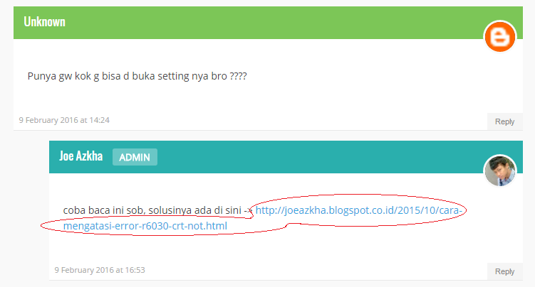 Komentar tersebut Joa buat untuk membantu mengatasi masalah yang dialami Sobatjoa dengan menyuguhkan link yang nantinya dibutuhkan untuk si Sobatjoa tersebut. cara membuatnya pun cukup mudah, dengan menyisipkan sedikit kode. Berikut ini contohnya.